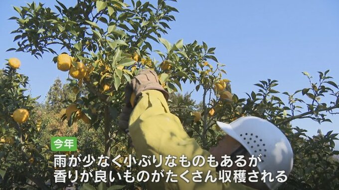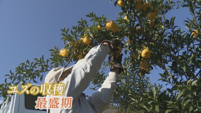 さわやかな香りが漂う畑では鮮やかな黄色に色づいたユズを農家が1つ1つ丁寧にハサミで切り取って収穫していました。