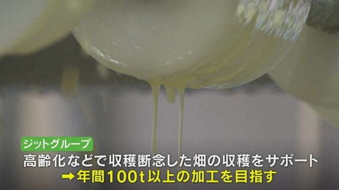 ジットグループは、高齢化などで収穫を断念した畑での作業をサポートしていて年間100t以上の加工を目指しています。
