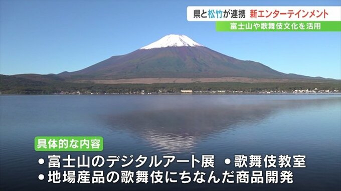 具体的には、松竹が映画のオープニングに使用している富士山が山梨県側から撮影されていることから、富士山のデジタルアート展や歌舞伎教室の開催、ジュエリーなど地場産業に歌舞伎にちなんだ商品開発を行います。