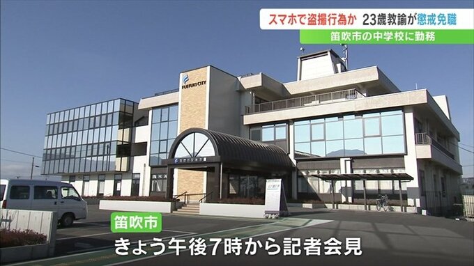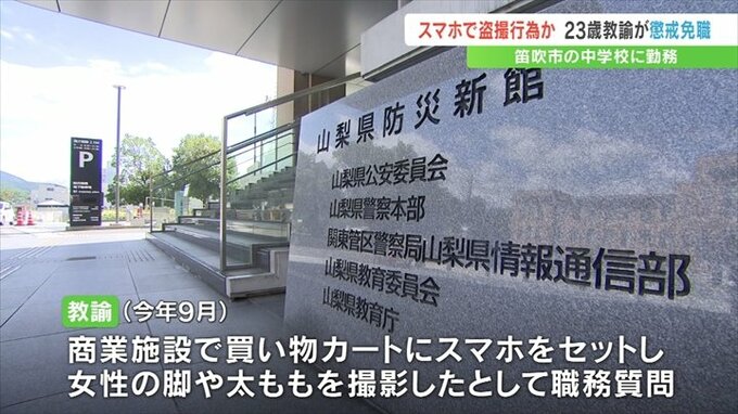 県教育委員会によりますと教諭は今年9月、笛吹市内の商業施設で買い物カートにスマートフォンをセットし、女性の脚や太ももを後方から撮影したとして警察官の職務質問を受けました。