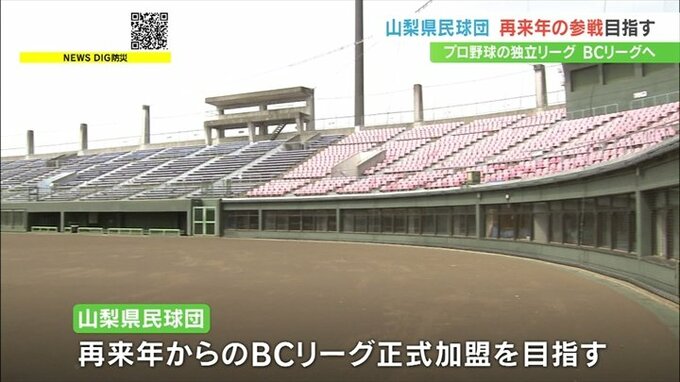 山梨県民球団は今年6月に独立リーグのBCリーグに準加盟しましたが、8月、来年の正式加盟は運営体制や球場の確保に不安な点があるとして認められませんでした。