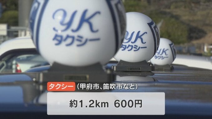 甲府市や笛吹市などの一般のタクシーは約1.2kmで600円。また、時速10km以下の時だけ、時間による料金が加算されるシステムです。