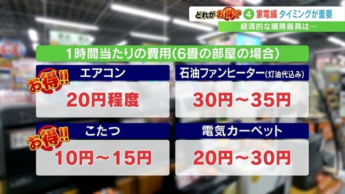 倉持副店長によりますとエアコンは20円程度、石油ファンヒーターは灯油の値上がりもあり、30円から35円、こたつが10円から15円で。電気カーペットは20円から30円です。