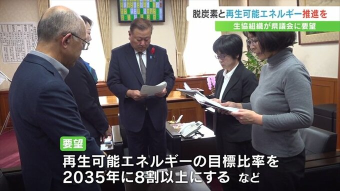 12日は関係者が県議会議長に対して、原子力や火力から再生可能エネルギーへの転換を進めるよう要望しました。