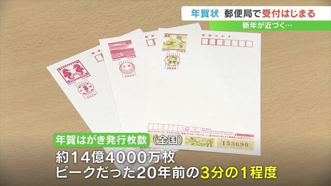 今年の年賀はがきの全国の発行枚数はおよそ14億4000万枚で、ピークだった20年前の3分の1程になっています。