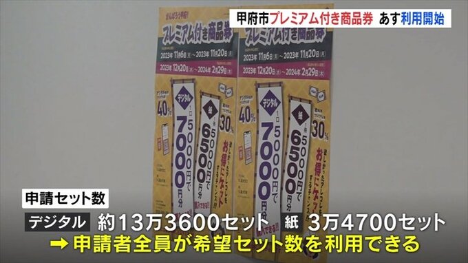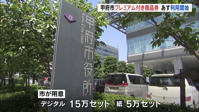 甲府市が市民限定で発行するプレミアム付き商品券は一口5000円で、紙の商品券は6500円、デジタル商品券は7000円分の買い物を市内ですることができます。