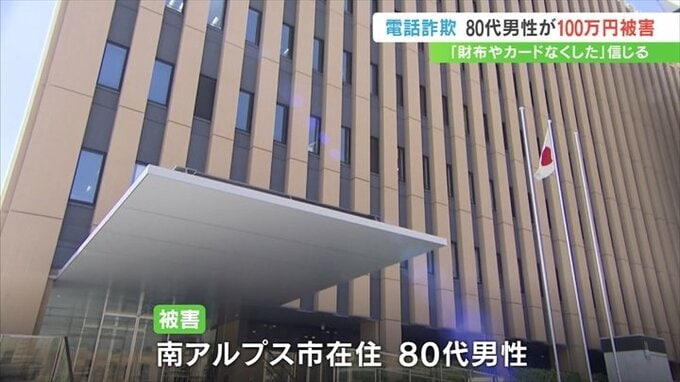 「財布や会社のカードを無くした」という息子をかたる男からの電話を信じ、山梨県南アルプス市の高齢の男性が現金100万円をだまし取られました。