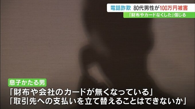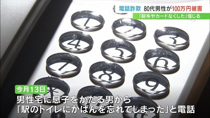県警によりますと12月13日、息子をかたる男から「駅のトイレにかばんを忘れてしまった」などと自宅の固定電話に連絡がありました。