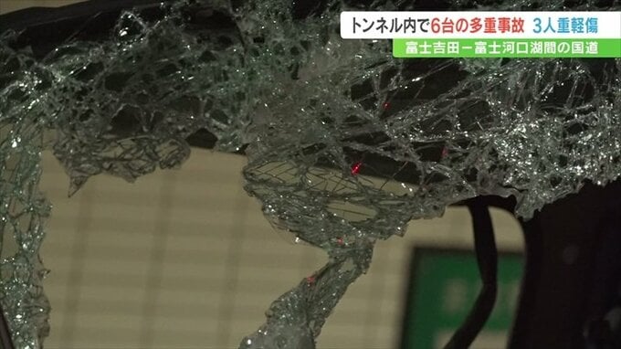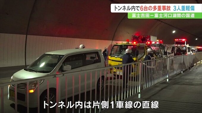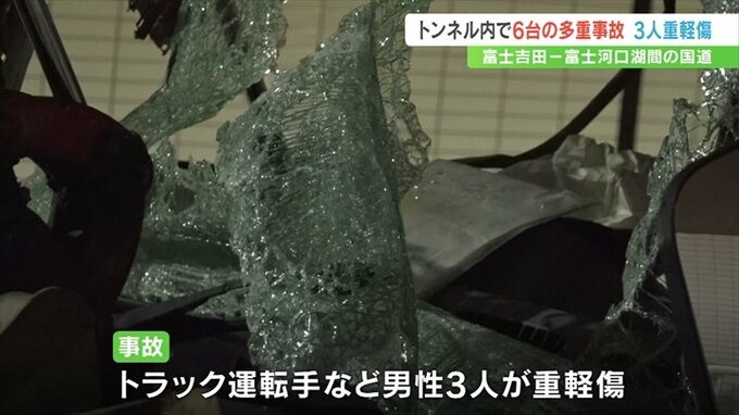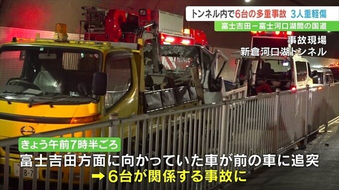 山梨県富士吉田市と富士河口湖町をむすぶ国道のトンネル内で19日朝、車6台が関係する事故がありました。この事故で男性3人が重軽傷を負いました。