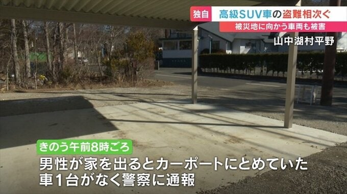 15日午前8時ごろ、山中湖村の男性が家を出たところカーポートに停めていた車1台がなく、警察へ通報しました。