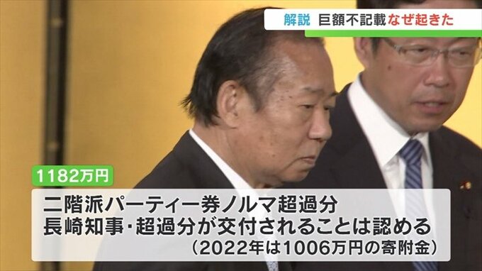 山梨県の長崎知事は20日、自らが代表を務める資金管理団体が、派閥のパーティー券の販売ノルマを超えた分として派閥から渡された1182万円を政治資金収支報告書に記載しないままにしていたと明らかにしました。