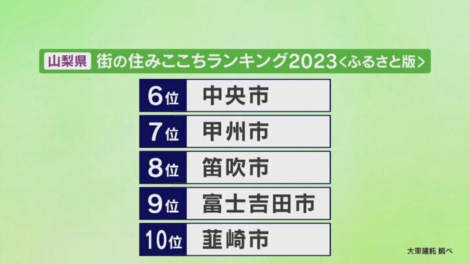 そして24日に県庁所在地と政令指定都市などを除く全国1381自治体、山梨県内は甲府市を除く26市町村のランキングが発表されました。