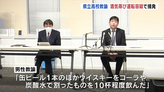 教諭は校長の聞き取りに対して「缶ビール1本のほか、ウイスキーをコーラや炭酸水で割ったものを10杯程度飲んだ」と説明しているということです。