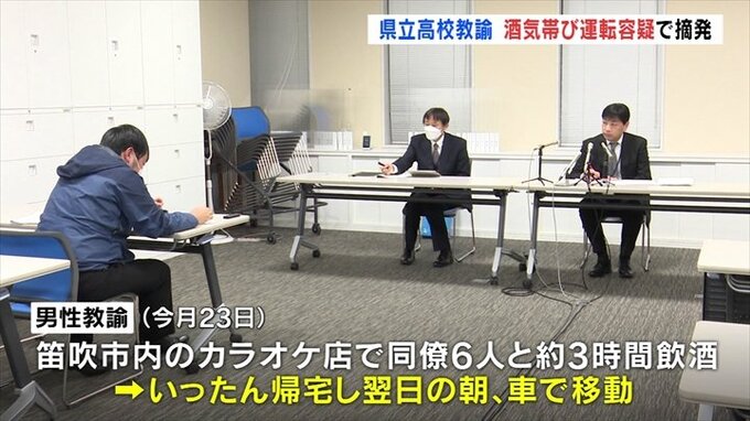 県教育委員会によりますと教諭は今月23日の午後7時半ごろから笛吹市内のカラオケ店で同僚6人と3時間ほど飲酒し、いったん帰宅して翌日の朝、車で移動していました。