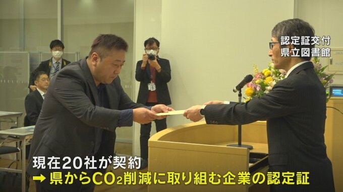 現在20社が契約していて29日はCO₂の排出削減に取り組む企業として県から認定証が贈られました。