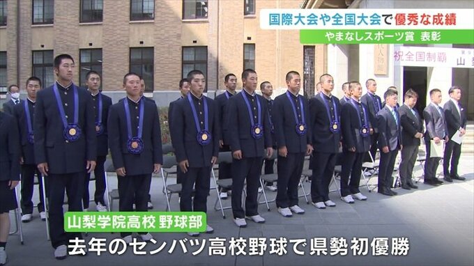 優秀な成績をあげたスポーツ選手らに贈られる県のやまなしスポーツ賞に去年のセンバツ甲子園で優勝した山梨学院高校野球部などが選ばれ表彰されました。
