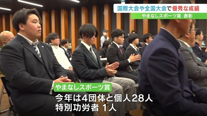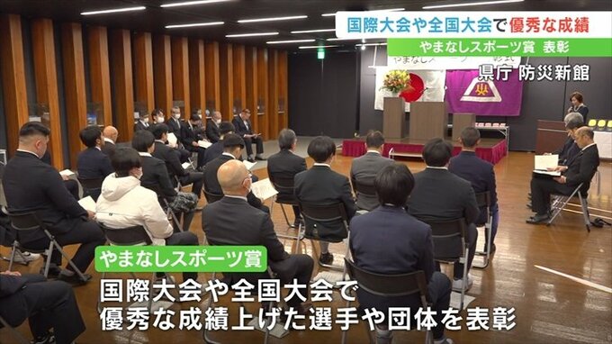 やまなしスポーツ賞は、国際大会や全国大会などで優秀な成績をあげた選手や団体などを県が表彰するものです。