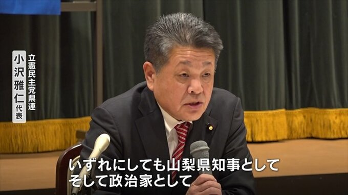 「いずれにしても山梨県知事としてそして政治家として政治的責任は免れないと思っていますので、この政治的責任をどのように果たすのか県民の皆さんに明らかにして頂きたいと思っております」