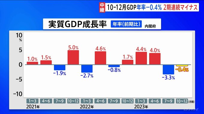 去年10月から12月までのGDP=国内総生産は、年率で0.4%のマイナスと、2期連続のマイナス成長となりました。また、去年1年間の成長率では、ドルに換算した名目GDPがドイツに抜かれ、世界4位に転落しました。中継で…