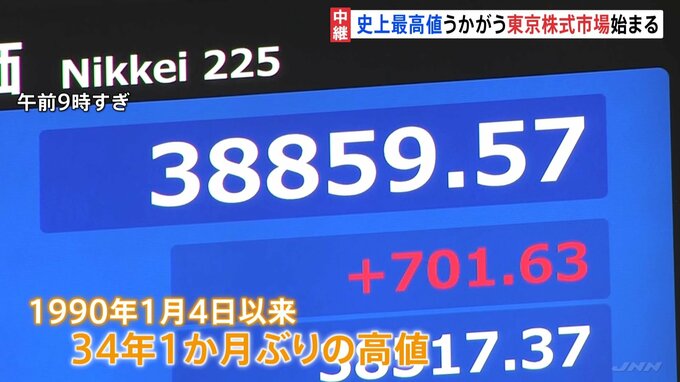 日経平均株価がきょうも大きく値上がりしています。東証から中継です。バブル期につけた史上最高値まで一時100円を切りました。記録更新が目前に迫っています。きょうの東京株式市場で日経平均株価は一時700円以上…