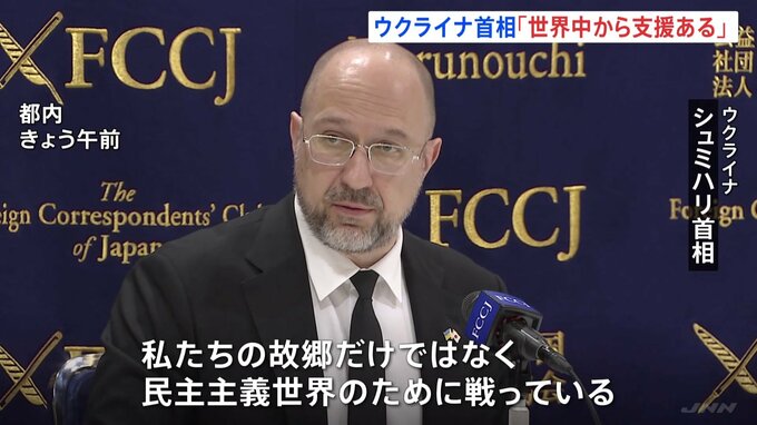 日本を訪れているウクライナのシュミハリ首相が会見し、欧米などで懸念されているウクライナへの「支援疲れ」について、「今は話す時ではない」として、さらなる支援を求めました。ウクライナ シュミハリ首相「我…