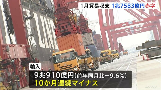 1月の貿易収支は1兆7583億円の赤字となりました。赤字となるのは2か月ぶりです。財務省が発表した1月の貿易統計によりますと、輸出額から輸入額を差し引いた貿易収支は1兆7583億円の赤字で、2か月ぶりの赤字となり…
