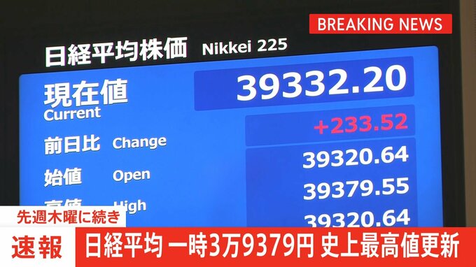きょうの東京株式市場で、日経平均株価は一時200円以上値上がりし3万9379円をつけ、取引時間中の史上最高値を更新しました。先週木曜日に続き、2営業日連続の最高値更新となります。