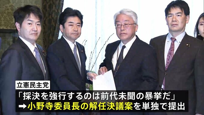 衆議院では来年度予算案の審議をめぐっても与野党の対立が激しくなっています。与党がきょう、予算案を委員会で採決する方針に野党側が反発し、立憲民主党は小野寺予算委員長に対する解任決議案を提出しました。来…