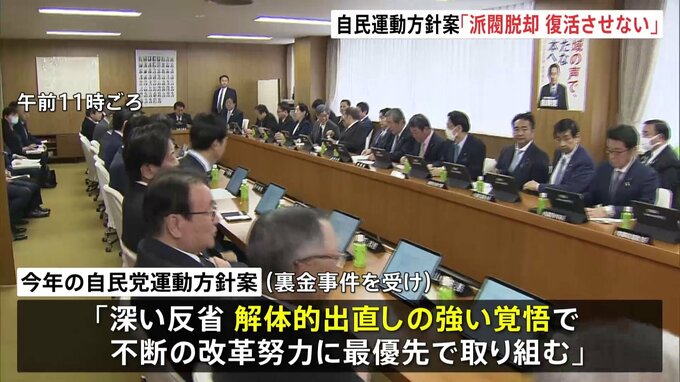 派閥の裏金事件を受け、自民党はきょう、「これまでの派閥から脱却し、二度と復活させない」などと記した今年の党の運動方針案を総務会で了承しました。今年の自民党の運動方針案では、裏金事件を受け、「深い反省…