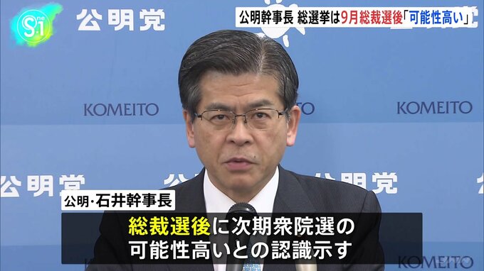 公明党の石井幹事長は、次の衆院選の時期について、今年9月に行われる予定の自民党総裁選後の「可能性が高い」との見方を示しました。石井幹事長は民放のBS番組で「自民党の総裁選で選ばれた総裁は非常に支持率が…