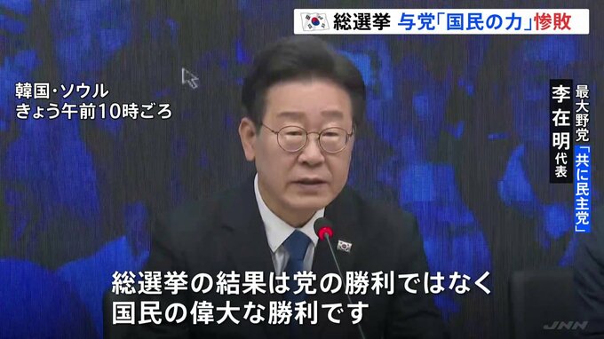 4年に1度の韓国総選挙がきのう行われ、最大野党の「共に民主党」が過半数を大幅に上回る議席を確保することがほぼ確定し、与党「国民の力」は惨敗しました。最大野党「共に民主党」 李在明 代表「総選挙の結果は…