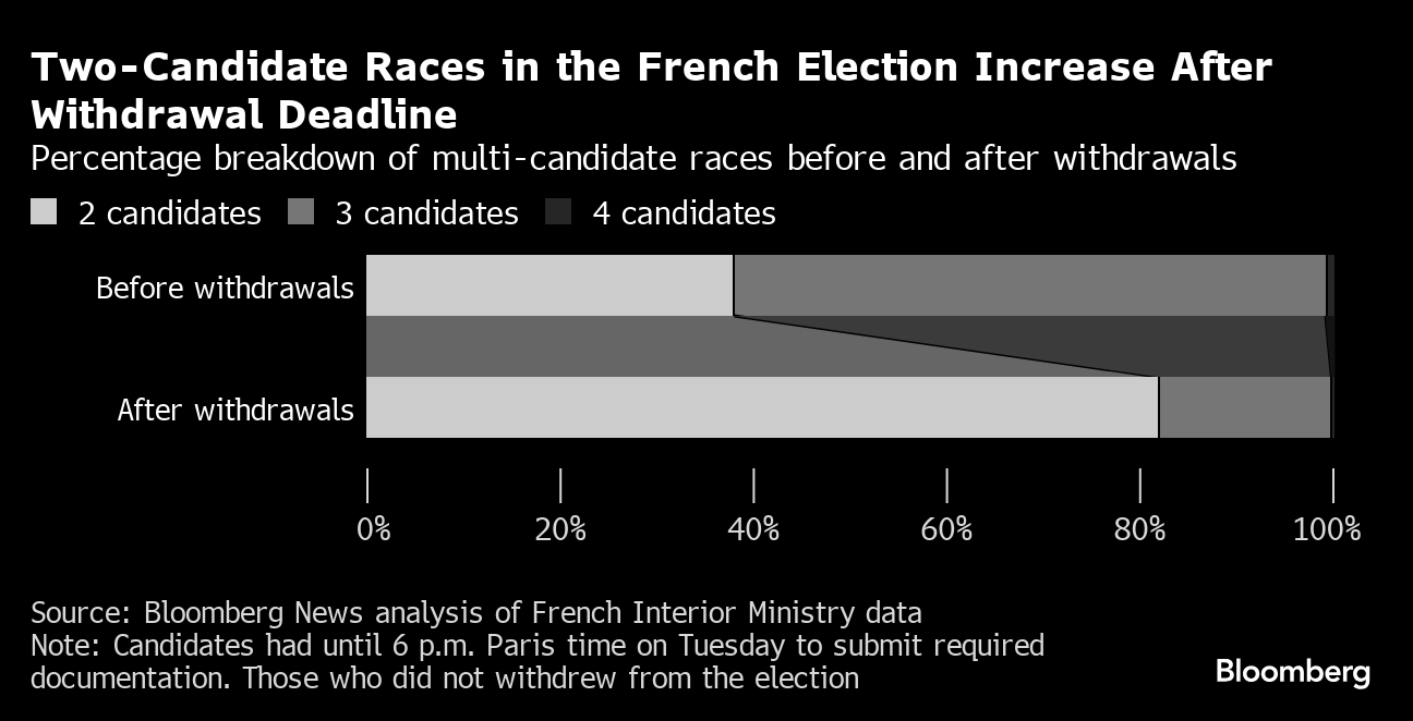 内務省が3日発表したデータによると、決選投票に2人以上が進んだ選挙区からマクロン大統領の中道グループは76選挙区で、左派連合の新人民戦線は130選挙区でそれぞれ候補者を撤退させた。これで決選投票が三つどもえの争いとなる選挙区は当初の306から89に減少し、RNは214の選挙区で競合陣営が一本化した候補と戦うことになる。四つどもえの選挙区も2つある。