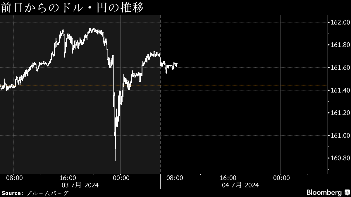 (ブルームバーグ): 4日の東京外国為替市場の円相場は1ドル=161円台後半と前日夕から横ばい圏で推移。米国で雇用や景況感などの経済指標が予想を下回り、年内の利下げ観測が強まったが、円売り基調は変わらず。約38年ぶり安値圏での推移が続き、政府・日本銀行による円買い介入への警戒感もくすぶったままとなっている。