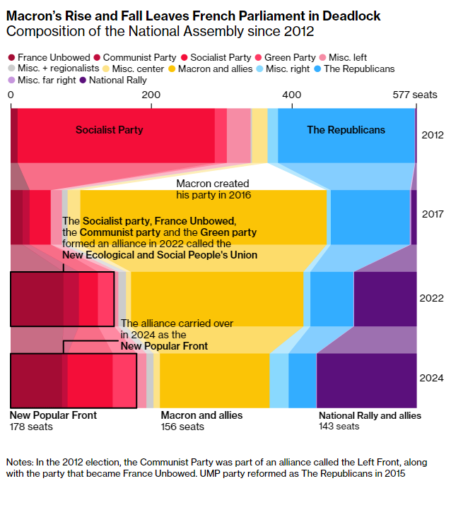 (ブルームバーグ): フランス国民議会(下院、定数577)選挙は7日、決選投票が行われ、左派連合「新人民戦線」が過半数には届かないものの最大勢力となった。過半数を確保して次期政府の組閣を狙っていた極右政党・国民連合(RN)は伸び悩み、実質的に率いるマリーヌ・ルペン氏は予想外の打撃を被った。