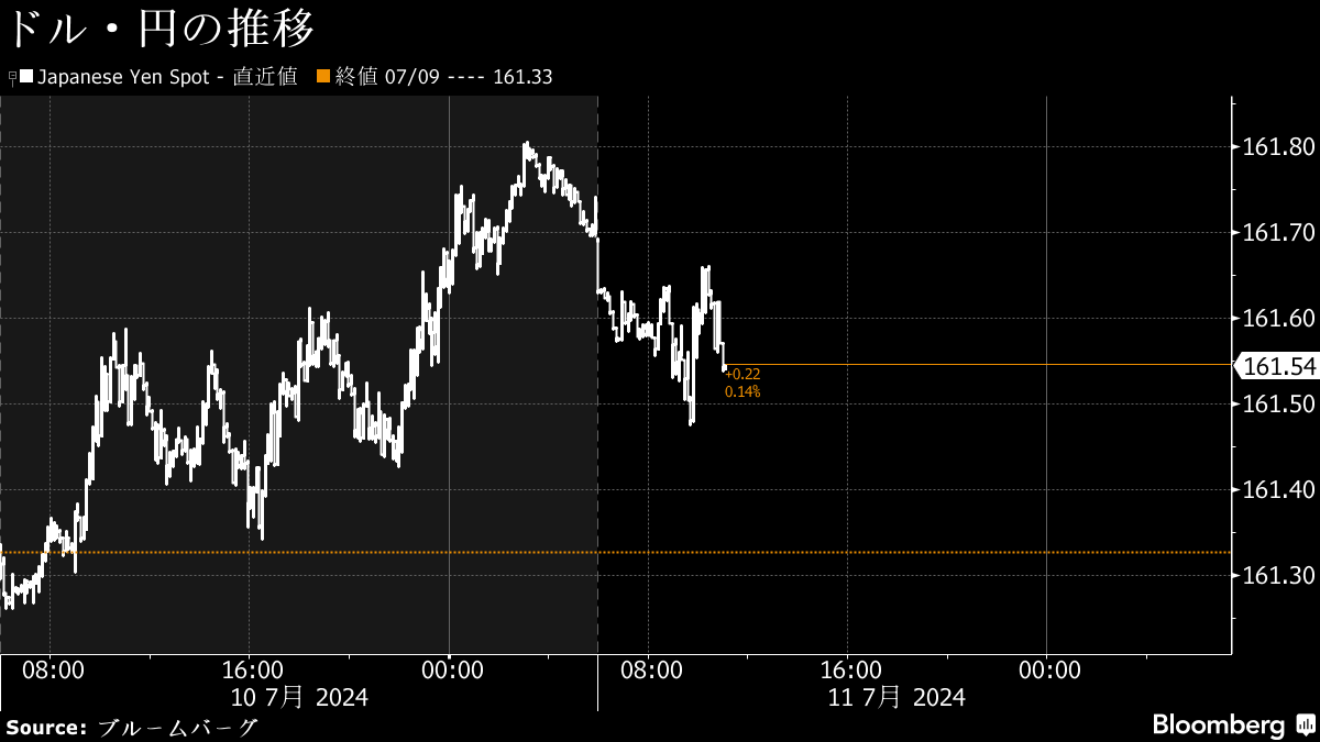 (ブルームバーグ): 11日の東京外国為替市場の円相場は1ドル=161円台半ばでもみ合い。日米の株高を背景としたリスク選好の流れから、低金利の円を売ってドルを買うキャリー取引の需要が根強い。一方、日本時間夜に発表される米国の消費者物価指数(CPI)が予想を下回った場合、米国の早期利下げを意識したドル売り・円買いが強まるリスクは警戒されている。