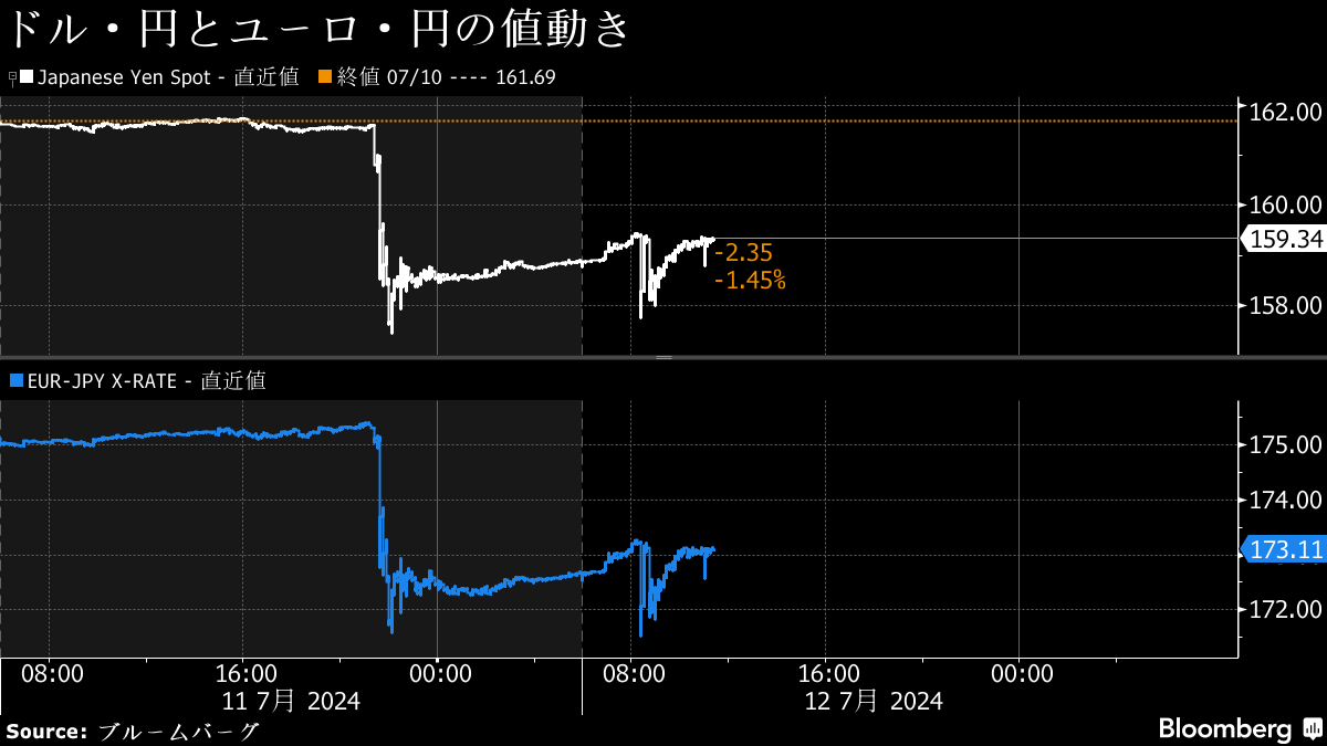 (ブルームバーグ): 12日の東京外国為替市場の円相場は乱高下。米国市場で急騰後、東京市場に入って159円台に売り直されていたが、一時157円台後半まで再び急伸した。政府・日本銀行の円買い介入観測が高まっている上、日銀が対ユーロで為替介入の準備のために市場参加者に相場水準を尋ねる「レートチェック」を行ったため、不安定な値動きが続いている。