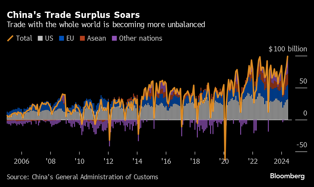 不均衡拡大に警戒を強める中国の貿易相手国・地域は、電気自動車(EV)など中国からの輸入品に関税を上乗せすることで対抗している。通商面の緊張で、欧州連合(EU)と中国の関係も悪化しており、中国は今週、EUの貿易障壁を巡り報復的な調査を開始した。