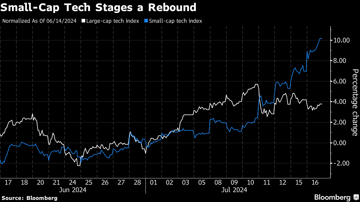 足元では小型株が好調で、これにはハイテク株も含まれる。小型ハイテク株の指数は16日に3%上昇し、昨年12月以来の大幅な上げを記録。一方、大型ハイテク株の指数は0.4%下落した。大型株は今年、依然として大きくアウトパフォームしhているが、ここ1カ月は小型株の方が好調だ。大型ハイテク株の3.8%上昇に対し、小型ハイテク株の上昇率は10%を超える。