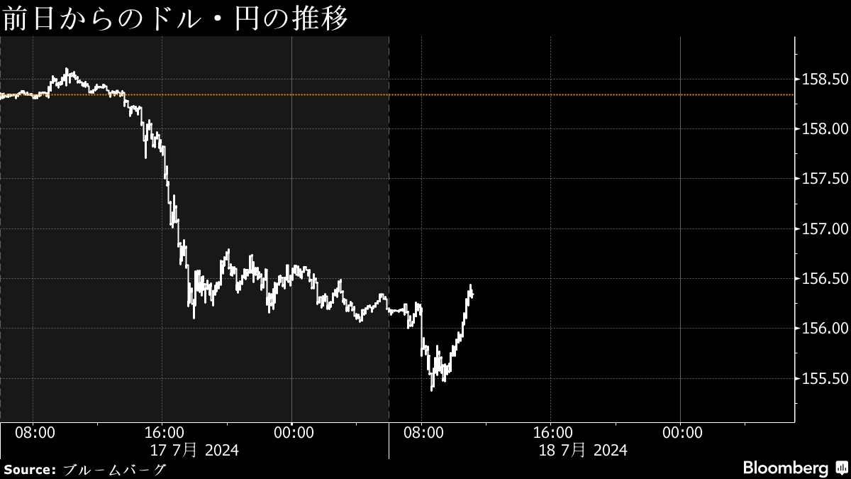 (ブルームバーグ): 18日の東京外国為替市場の円相場は1ドル=156円台半ばまで下落。1カ月ぶりの円高水準を受けて、国内輸入企業など実需のドル買いが強まっている。朝方は日本銀行に利上げを求めた河野太郎デジタル相のインタビュー記事をきっかけとした、円売りポジションの巻き戻しから一時155円台前半まで上げ幅を拡大していた。