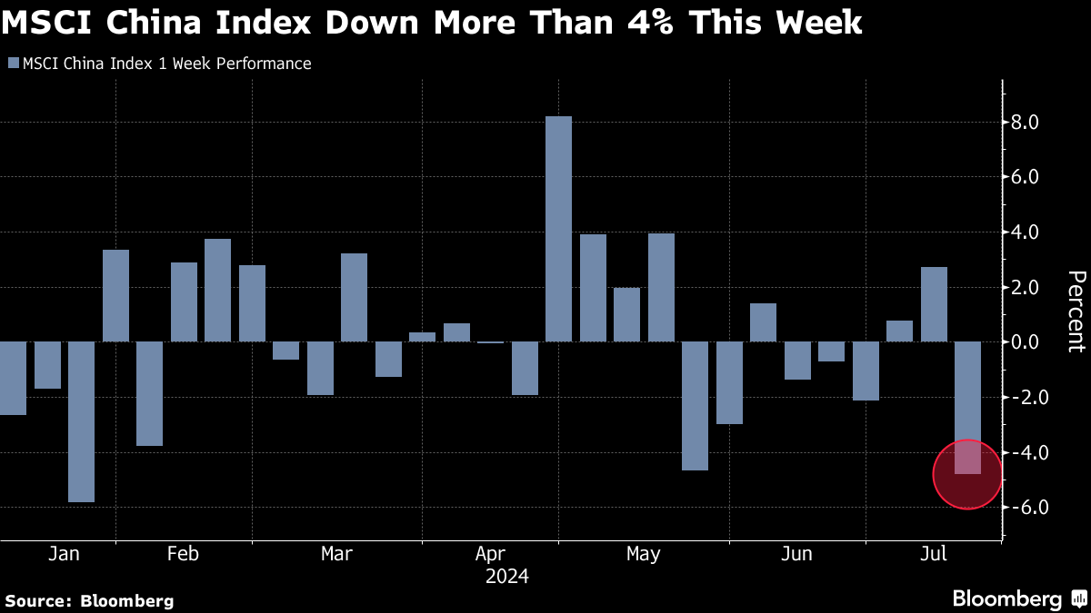 (ブルームバーグ): 中国株の指標MSCI中国指数は19日の取引で一時1.7%下げ、今週は全営業日で値下がりした。中長期の経済政策を討議する中国共産党の重要会議、第20期中央委員会第3回総会(3中総会)のコミュニケの内容は、経済成長の新たな推進力について投資家を納得させるに至らなかった。