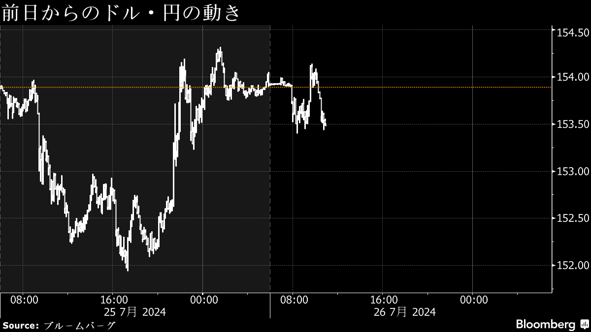(ブルームバーグ):26日の東京外国為替市場の円相場は1ドル=153円台半ばへ小幅上昇。金融機関が外為取引の基準レートとする公示仲値の設定にかけて一時売られたが、日米の金融政策決定を来週に控えて、円売りポジションを巻き戻す動きが根強い。