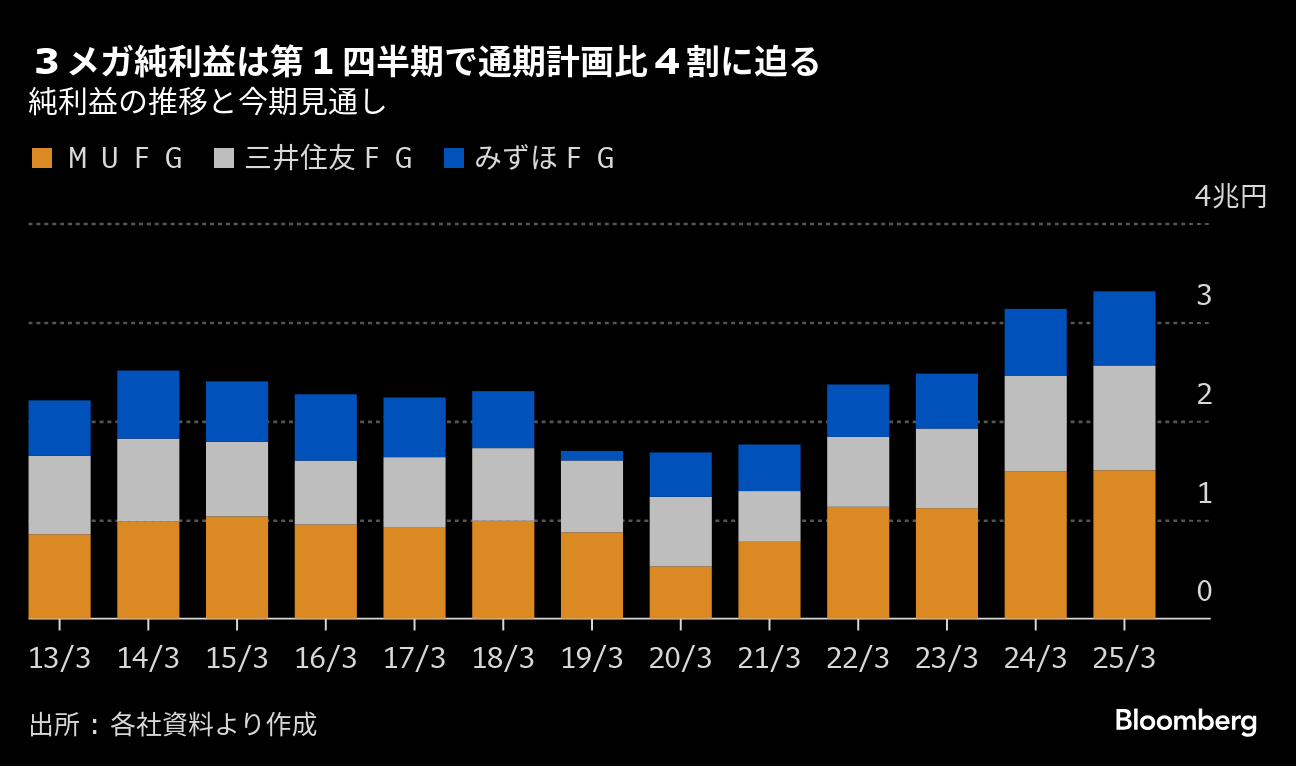 (ブルームバーグ):3メガバンクグループの2024年4-6月期(第1四半期)決算が2日、出そろった。連結純利益は合計で前年同期比16%増の1兆2166億円となり、今期(25年3月期)の計画(3兆3100億円)に対する進捗(しんちょく)率は38%に達した。