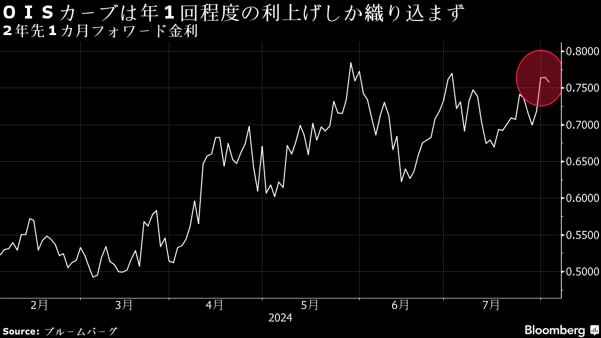 ブルームバーグが1日実施した調査では、エコノミストの68%が日銀は年内にさらに利上げに踏み切ると予想。最多は12月の44%で、10月は24%、20%は来年1月を見込む。一方、金融市場では金融政策見通しを反映するオーバーナイト・インデックス・スワップ(OIS)で2年先1カ月フォワード金利は0.75%と、1年に1回程度の利上げしか織り込んでいない。