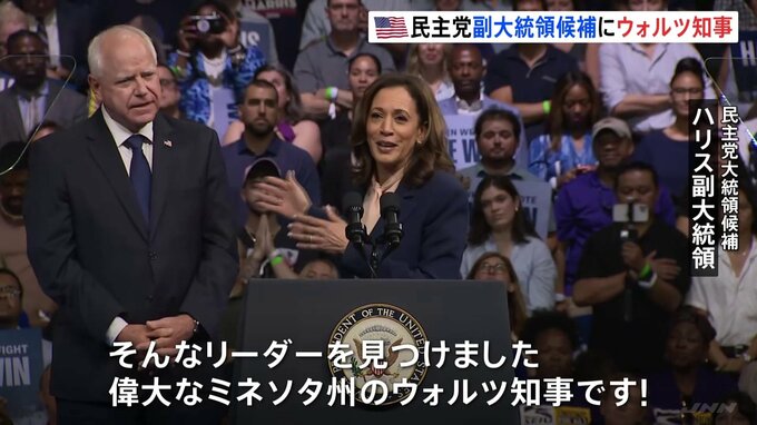 アメリカ大統領選挙で民主党候補に決定したハリス氏が、副大統領候補に選んだミネソタ州のウォルズ知事とそろって選挙集会を開きました。民主党大統領候補 ハリス副大統領「我々の国を団結させ、前進させ、中流階…