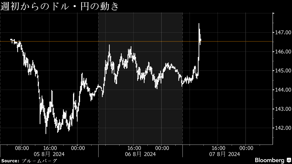 (ブルームバーグ):7日の東京外国為替市場の円相場は続落。日本銀行の内田真一副総裁が金融市場が不安定な状況で利上げしないと発言したことを受けて投資家心理が改善、円の売り戻しが強まった。対ドルでは一時147円台半ばと2%超下落、週初からの上げを解消した。