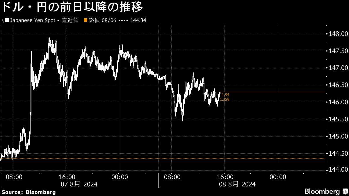 東京外国為替市場の円相場は対ドルで146円を挟む荒い値動き。日経平均が一時800円超下落する場面では、投資家心理の悪化による円売りポジションの買い戻しが優勢になり、145円台前半まで上昇した。金融機関が外為取引の基準レートとする公示仲値にかけてはドルが買われたほか、株価の下げ渋りに伴い146円台に戻した。