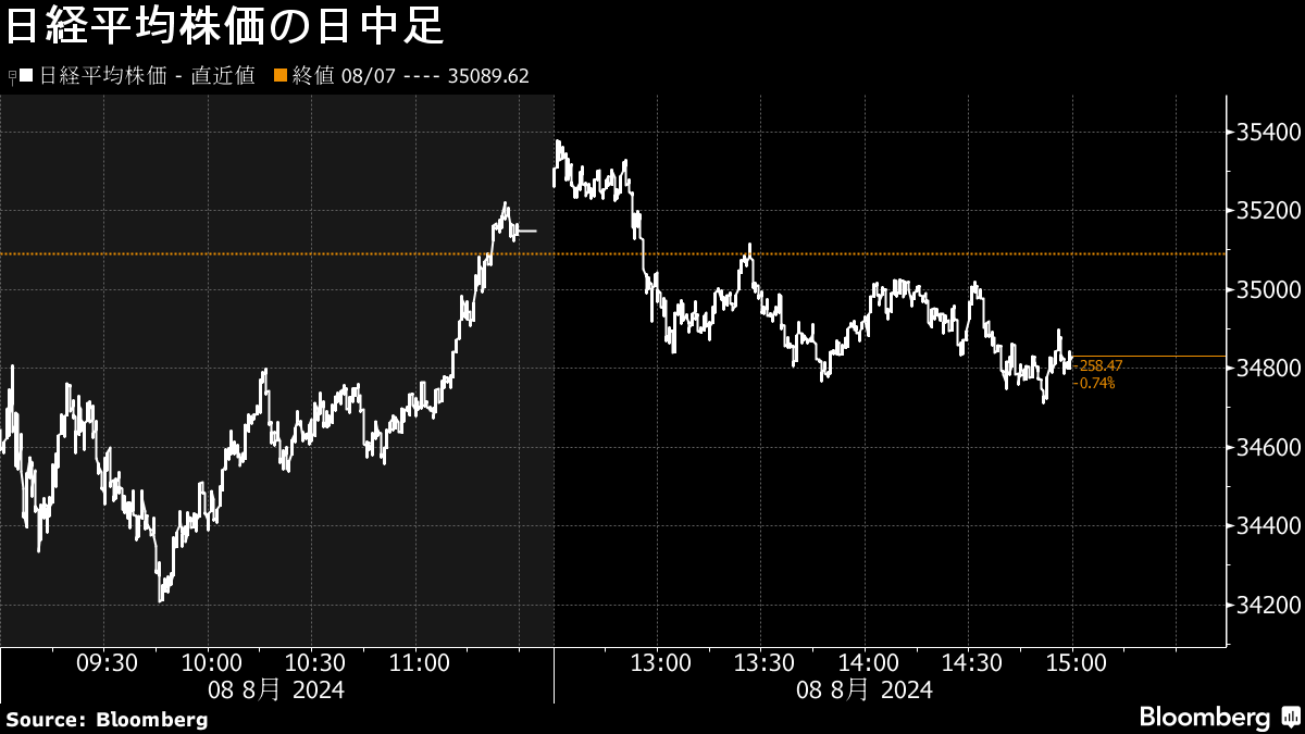 (ブルームバーグ):8日の日本市場では株式が反落。米国経済や金利の先行きに不透明感がくすぶる中、投資家の売り買いが交錯し、日経平均株価は荒い値動きとなった。株価にらみの円も乱高下。債券は順調な結果となった30年国債の入札後に超長期債を中心に上昇基調を強めた。