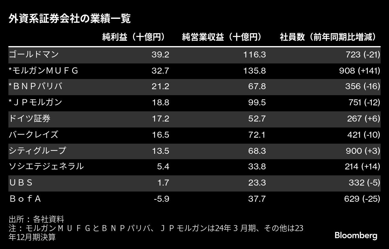 決算期は異なるものの、モルガンMUFGの純利益は国内で事業展開する外資系証券会社の中で392億円を計上したゴールドマン・サックス証券(12月期決算)に次ぐ水準。3月期決算の企業では、BNPパリバ証券の純利益がコスト増もあり前の期比33%減の212億円。JPモルガン証券は同32%減の188億円だった。