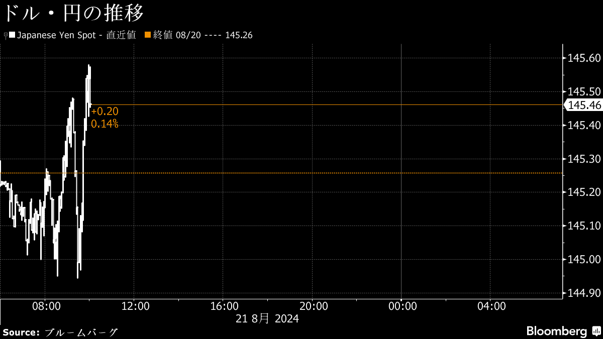 (ブルームバーグ):21日の東京外国為替市場で円相場は1ドル=145円台半ばに下落。米国の利下げ観測を背景としたドル安が急速に進んだため、節目の145円割れでドルを買う動きが出た。