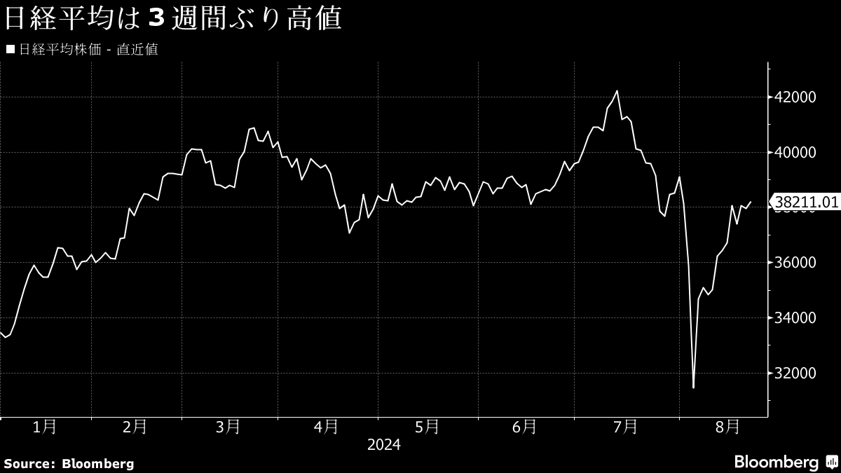 (ブルームバーグ):22日の日本市場では株式が反発し、日経平均株価は7月31日以来の高値を付けた。米国の利下げ観測が強まり、世界景気を下支えしていくとの見方から投資家のリスク選好度が高まった。ただ、あすの日米中央銀行トップの発言を前に様子見ムードが強く、前日終値を下回る場面もあった。債券や為替も方向感を欠いた。